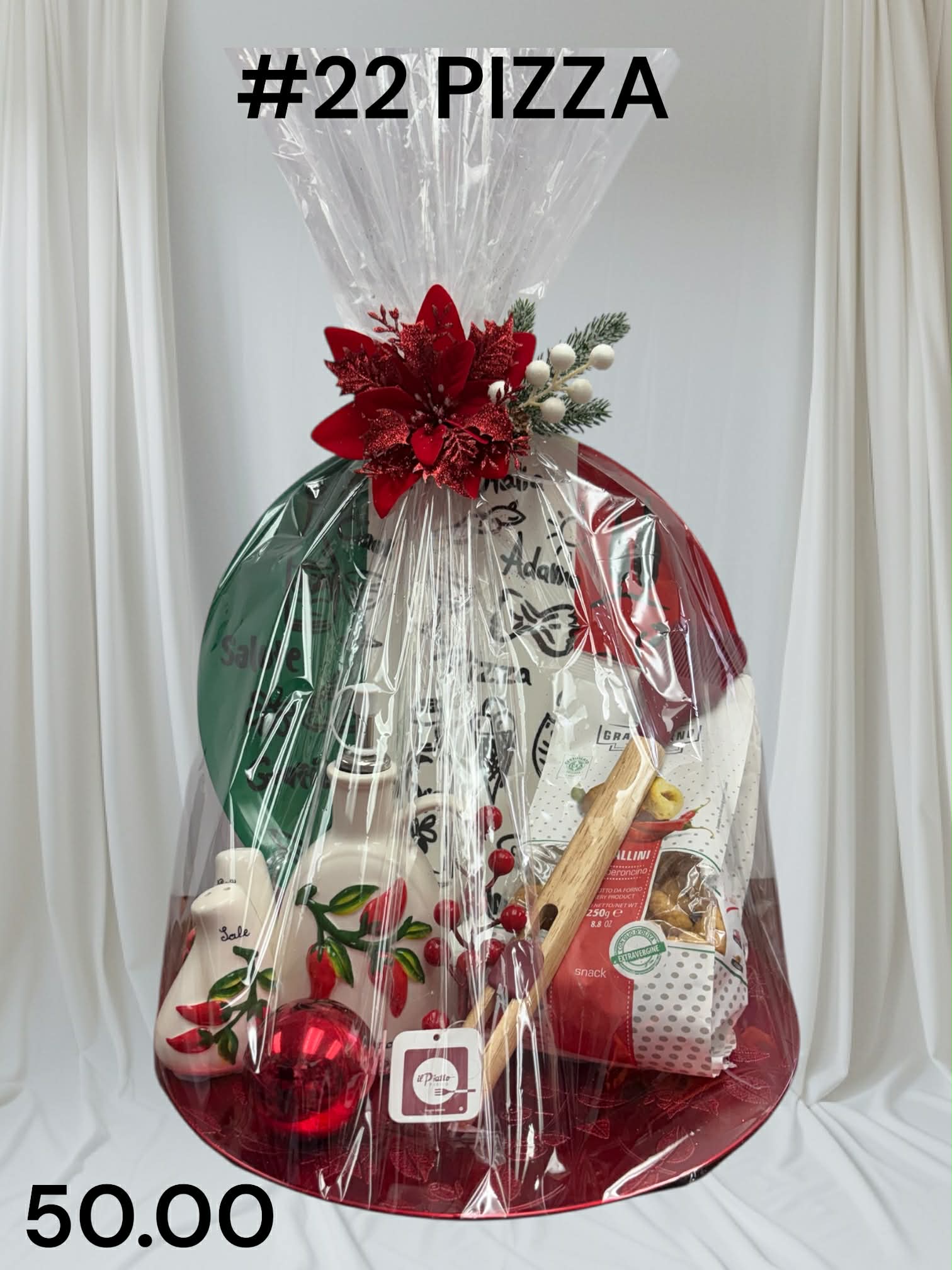 The red, green, and white color palette reinforces the Italian theme, while the mix of usable kitchen items + gourmet food increases long-term value.